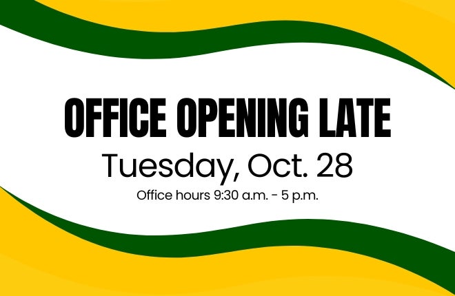 Our office will open late on Tuesday, Oct. 28, for an all-employee meeting. Office hours will be 9:30 a.m. to 5 p.m. You can still make payments through our automated system or report outages by calling 800-677-2667.